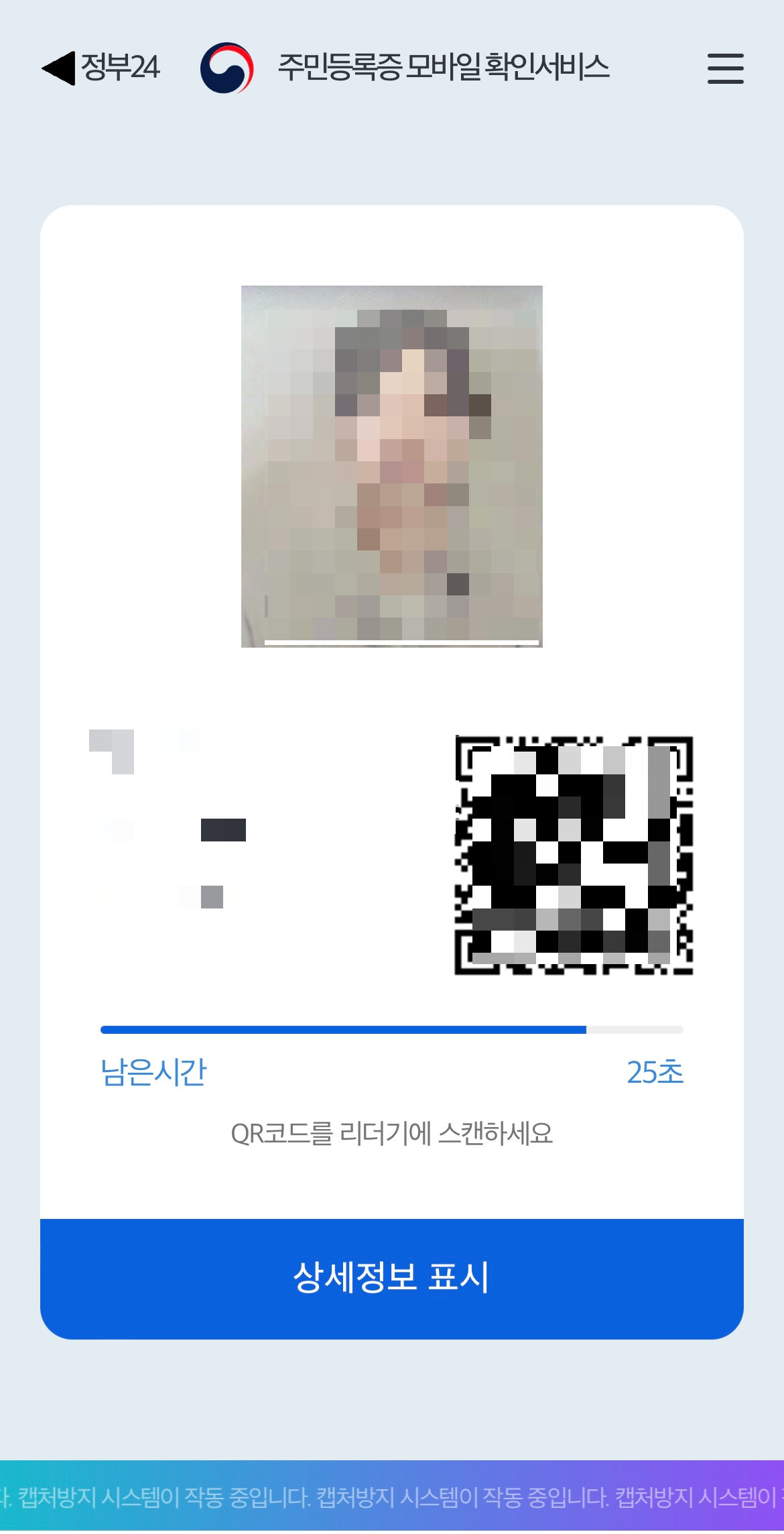 모바일신분증 발급방법이 성공적으로 서비스 등록 완료되면 사진, 거주지 등록번호, QR코드가 제공돼요.