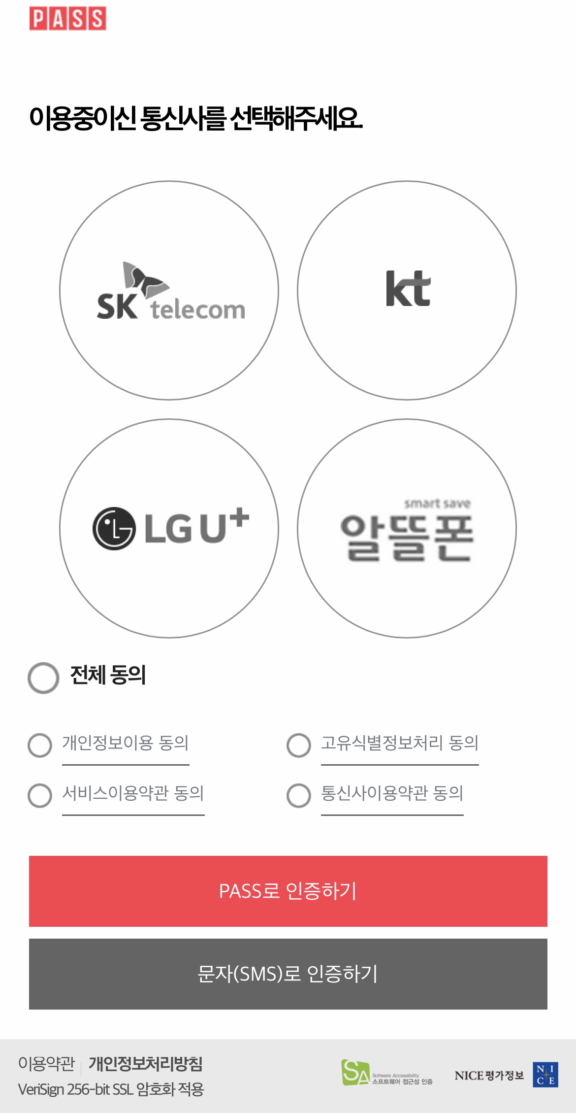 Pass로만 인증해야 하기에 번거롭기는 하지만 통신사 선택 후 문자 인증이 사라지는 문제로 다시 Pass 인증 앱을 설치하여 인증해야 해요.
