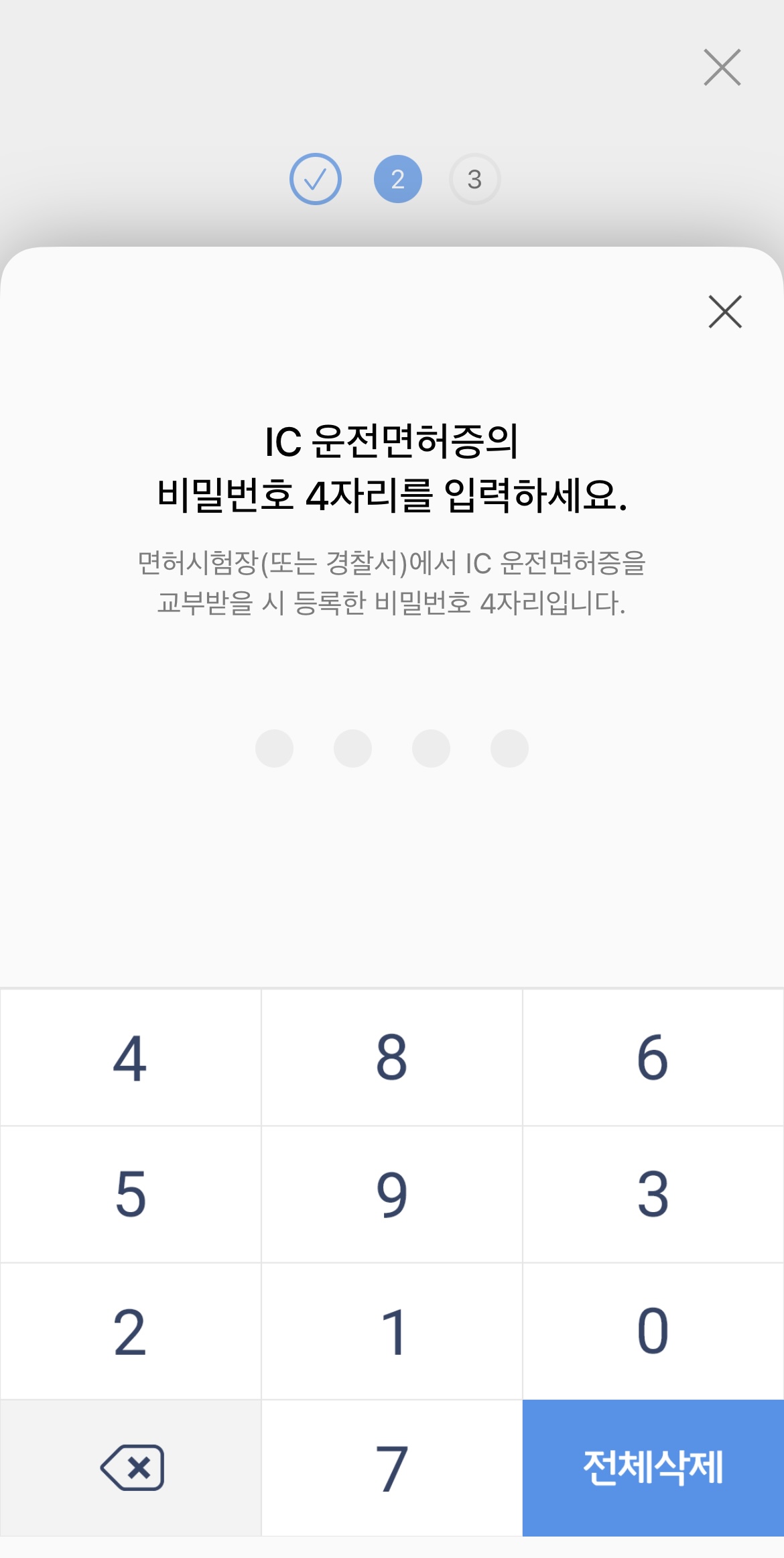 5. IC 운전면허증의 개인 암호 네 자리를 입력하십시오.