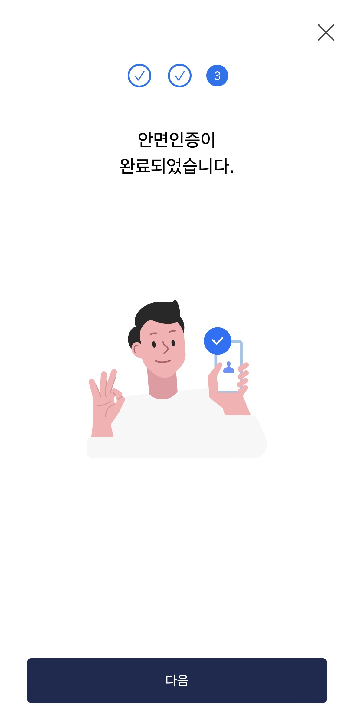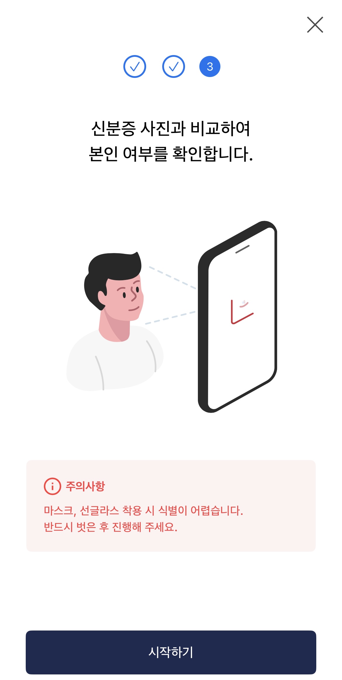 7.본인 확인이 완료되면 신분증 사진과 대조하여 안면 인증을 진행합니다. (가능한 한 운전면허증 사진과 유사하게 촬영합니다.).