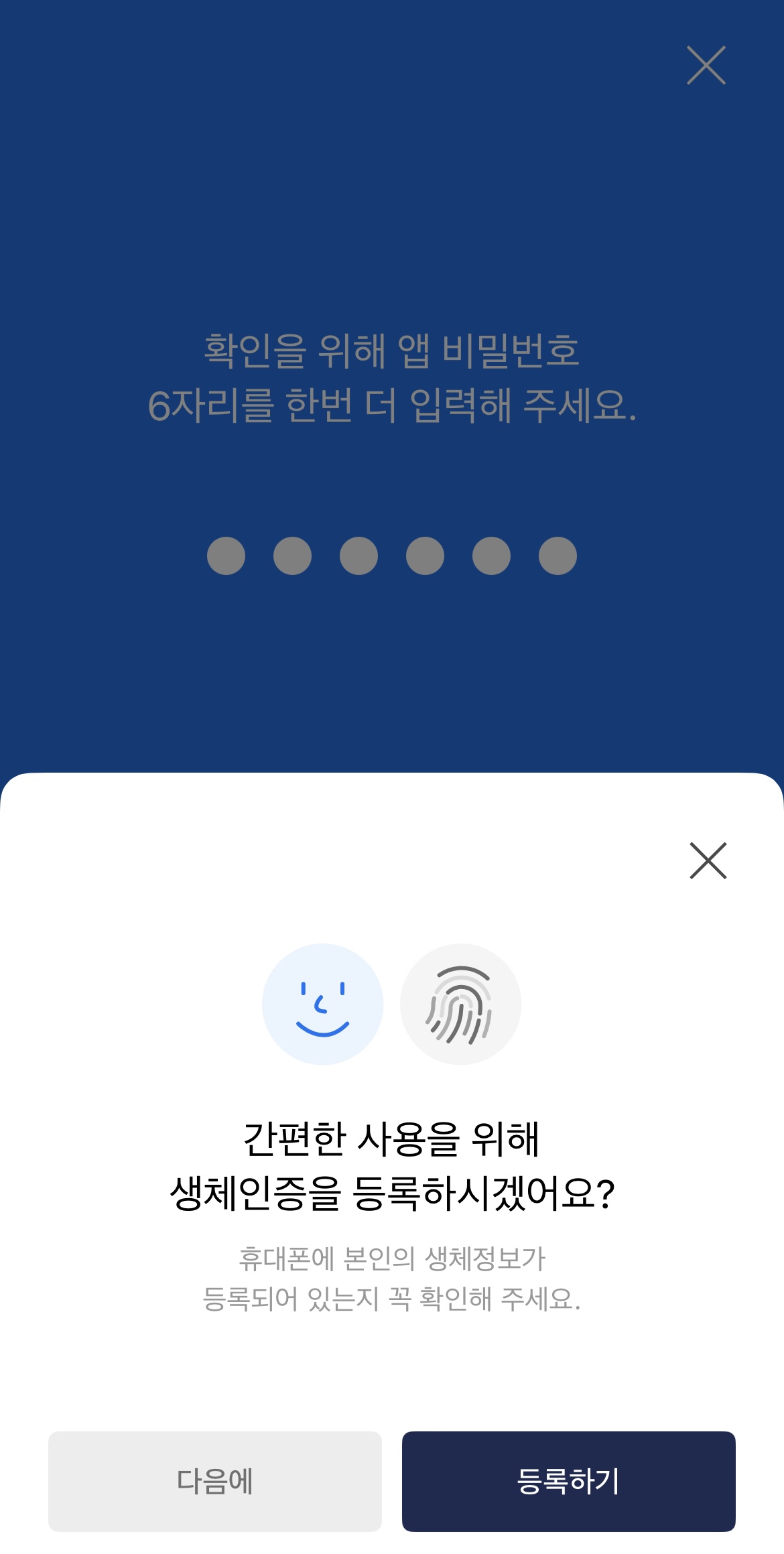 6. 편리한 이용을 위하여 생체 인식 기능을 등록하라는 안내가 나타납니다. 등록은 지금 하셔도 되고, 나중에 하셔도 무방합니다.