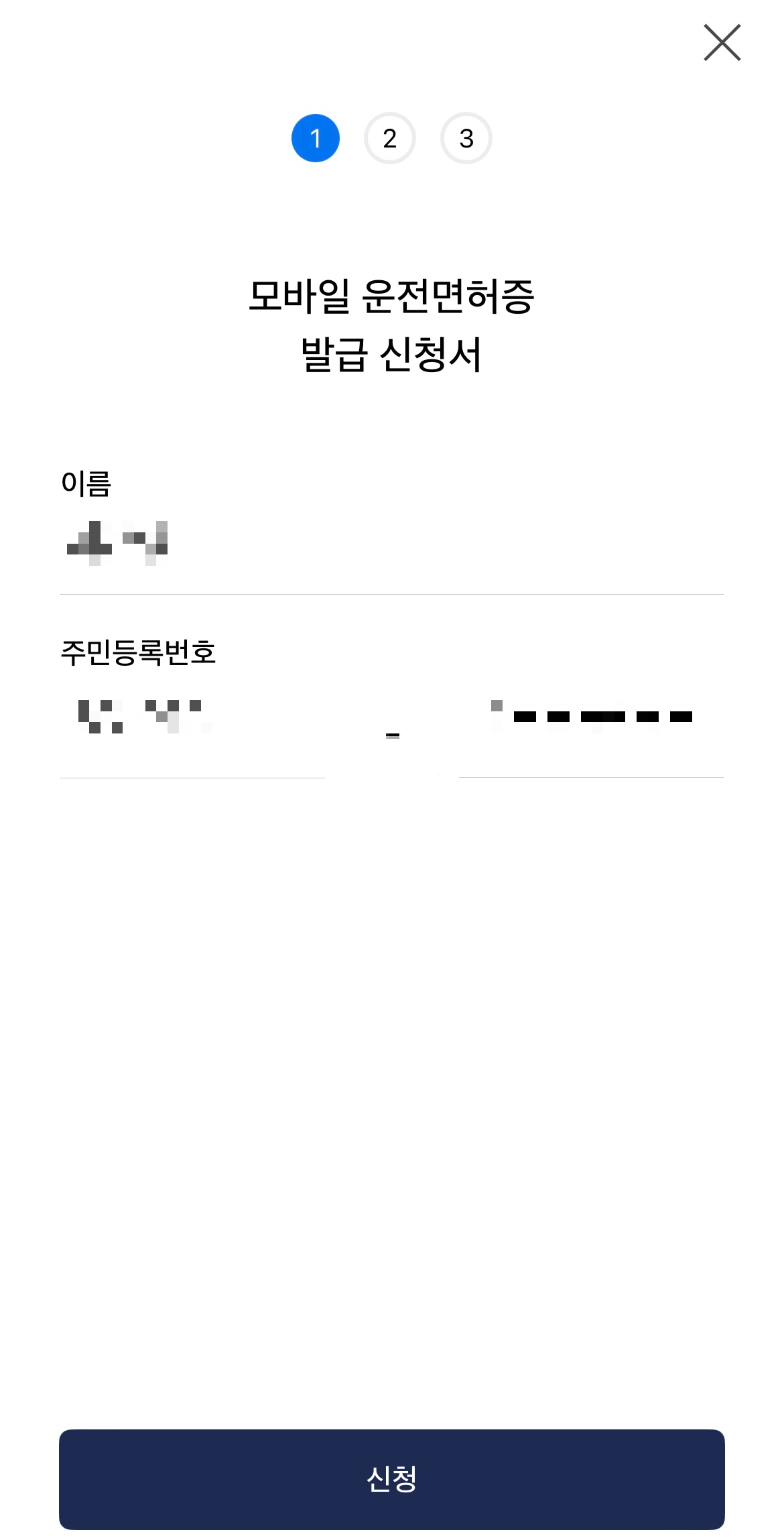 3. 모바일 운전면허증 발급 신청서에 성명과 생년월일이 자동으로 입력되어 있으며, 해당 정보가 일치하면 '신청' 버튼을 누릅니다.